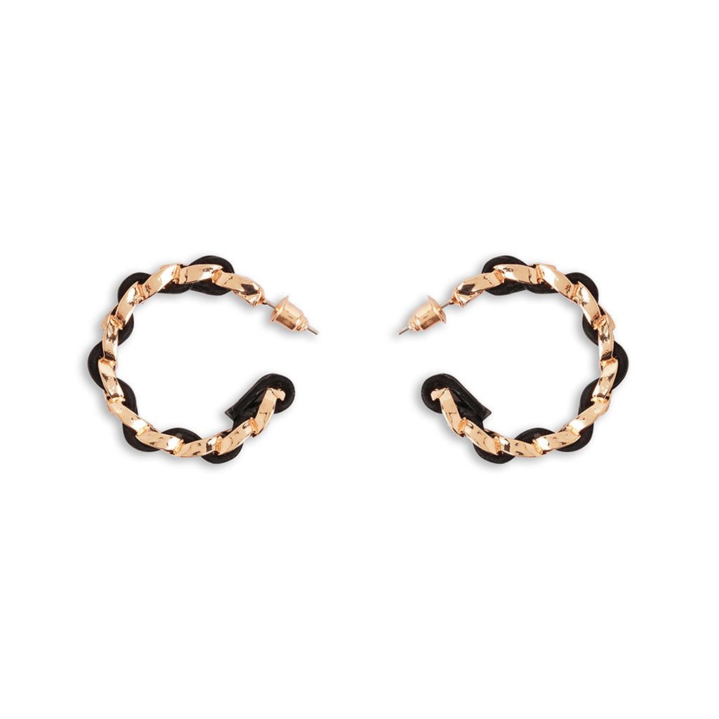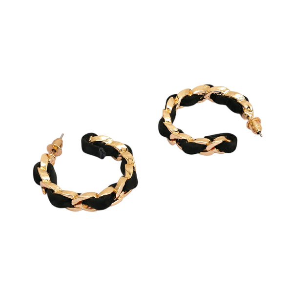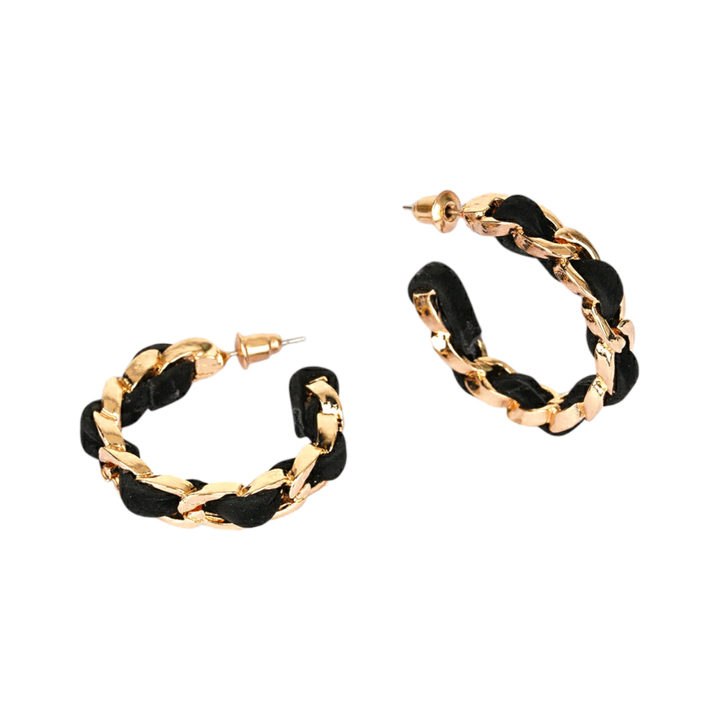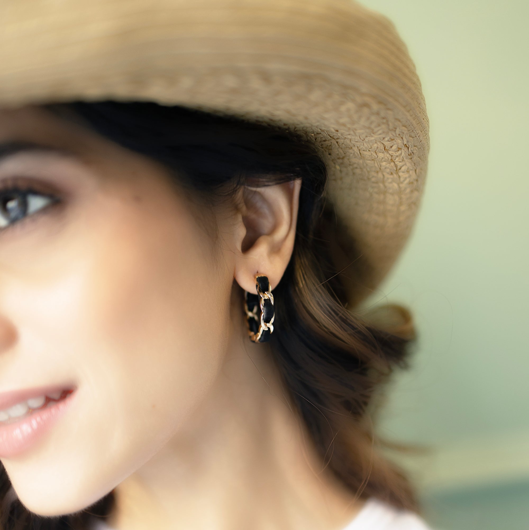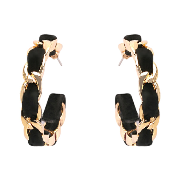 These earrings are perfect for adding a touch of elegance to any outfit. Their black and gold color and hoop design create a timeless yet trendy look that is sure to turn heads.